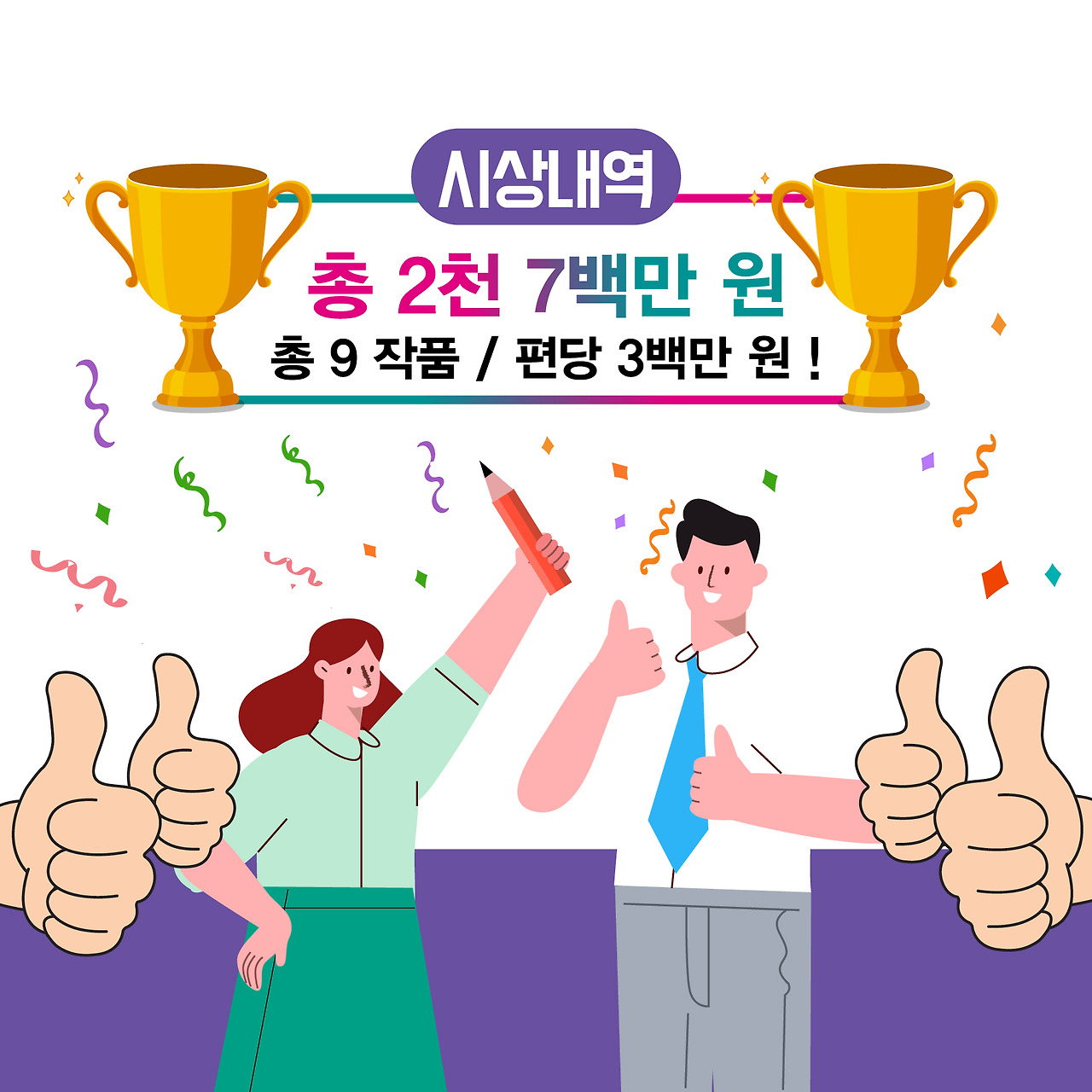 이번 공모전의 총 시상 금액은 무려 2700만원! 총 9작품을 선정하여 편당 300만원의 시상금이 지급될 예정인데요. 위 시상금액에는 2차저작권양도에 대한 포상금도 포함된 금액인 점 참고하세요. 또한, 총 9작품 중 4장품은 문화예술 착장자 발굴·육성을 위해 제주거주자(주민등록상)로 선정됩니다.