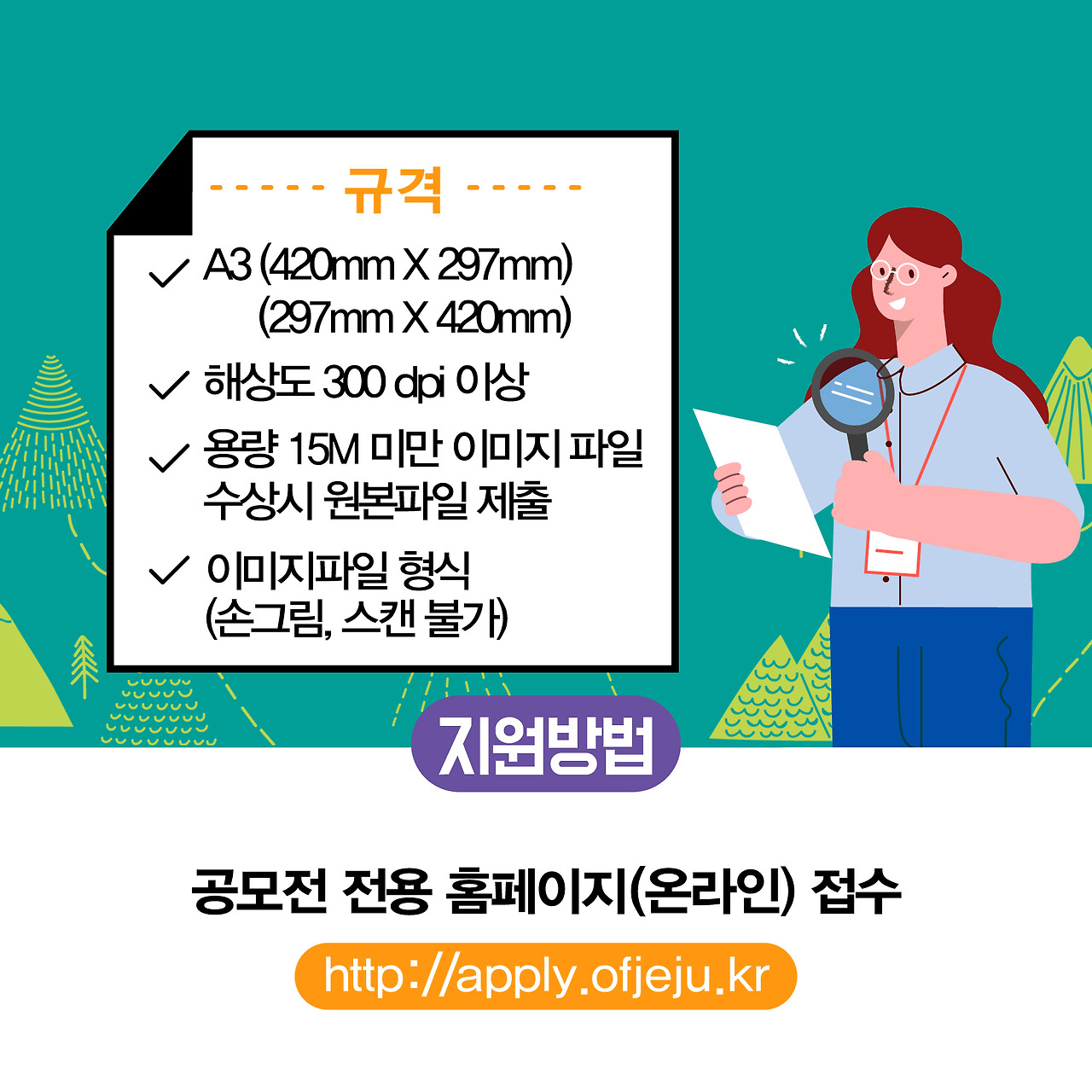 제주'오름'활용 디자인 공모전 작품파일은 이미지 파일 형식(JPG, JPEG, PNG, GIF, BMP)이어야 하며, 손그림과 스캔은 불가합니다. 규격은 A3 (420mm×297mm) / (297mm×420mm), 해상도 300dpi 이상, 용량 15M미만 이미지 파일료 변환 후 제출 해야 합니다. 또한 수상 시에는 원본파일(300dpi 이상의 ai, psd 등)을 제출 해야 하는 점도 참고하세요.