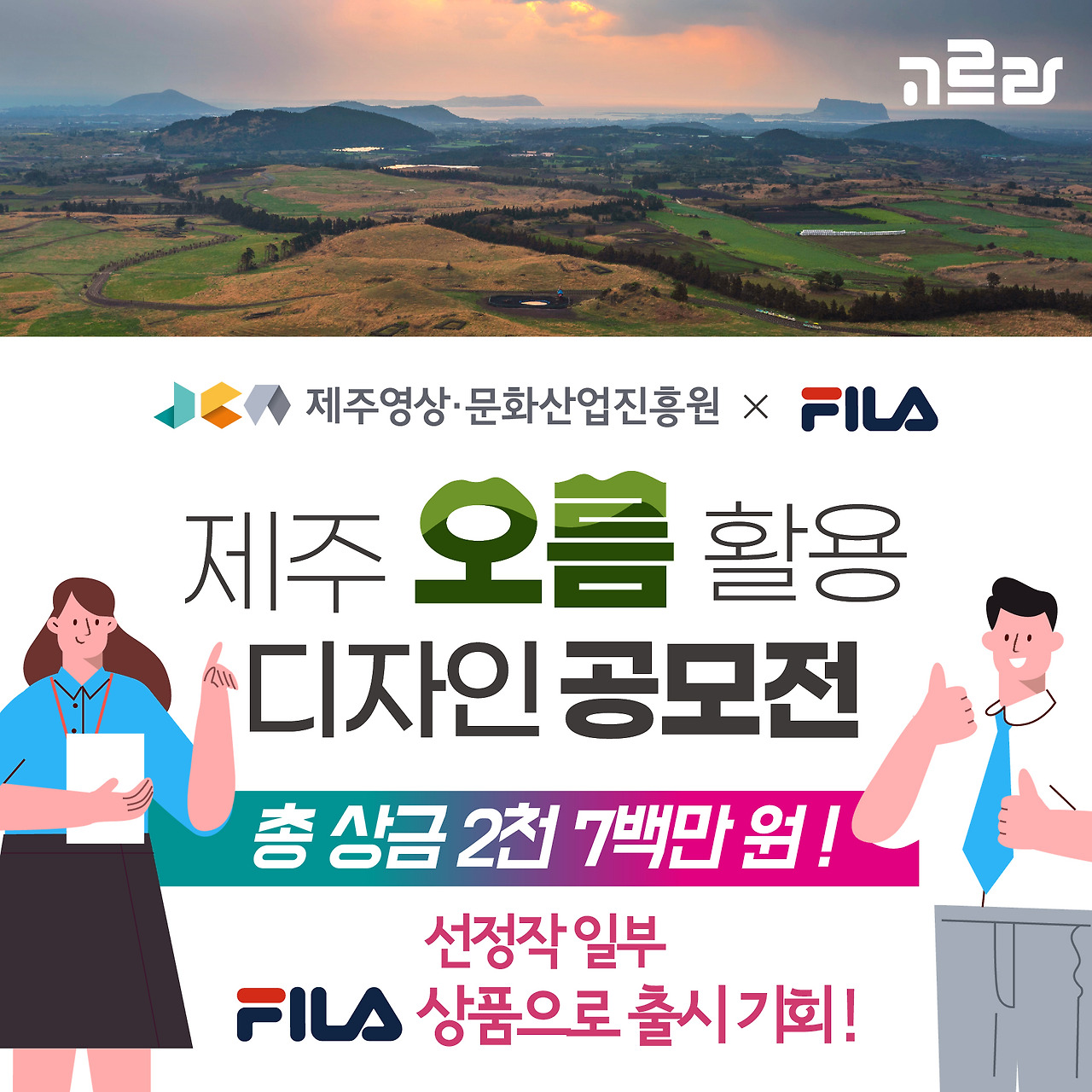 이번 공모전은 (재)제주영상·문화산업진흥원과 FILA가 함께주관하며, 제주의 아름다움을 품고 있는 오름의 다양한 문화적 콘텐츠들을 활용하여, 디자인 공모전을 통한 도내창작자 및 개인창작자를 발굴하고 제주 문화콘텐츠산업을 육성하기 위한 공모전인데요. 디자인에는 정답이 없기 때문에, 오름이 가지고 있는 매력을 표현할 수 있는 분들이라면 지금 바로 도전해보세요!