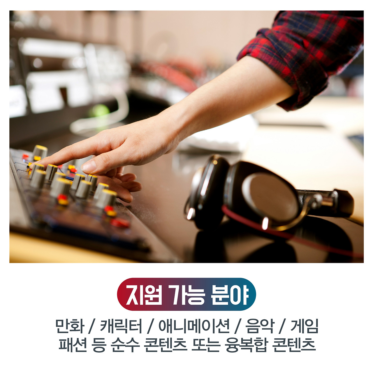 만화/캐릭터/애니메이션/음악/게임/패션 등 순수 콘텐츠 또는 융복합 콘텐츠를 가진 독창적인 창업아이디어를 보유한 창업 초기기업에 한하여 지원하는데요. 영화(영화진흥위원회), 출판(한국출판문화산업진흥원), 디자인(한국디자인진흥원), 공연 등 문화예술(한국문화예술위원회), 공예(한국공예디자인문화진흥원), 문화재(문화재청) 등은 지원분야에서 제외된답니다. 하지만 지원제외 분야를 포함한 융복함 콘텐츠를 기획할 경우 지원 가능한데요. 정확한 내용은 공고문을 통해 꼼꼼히 확인하시기 바랍니다.