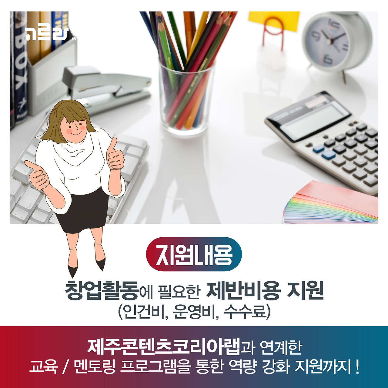 지원하고 선정이 된다면 사업비 조성 심의를 통해 신청 금액의 적정성과 예산범위 등을 고려하여 창업활동에 필요한 제반 비용인 인건비, 운영비, 수수료를 지원함과 동시에 제주 콘텐츠코리아랩과 연계한 교육/멘토링 프로그램을 통해 역량 강화 지원까지 함께 이루어질 예정이랍니다.