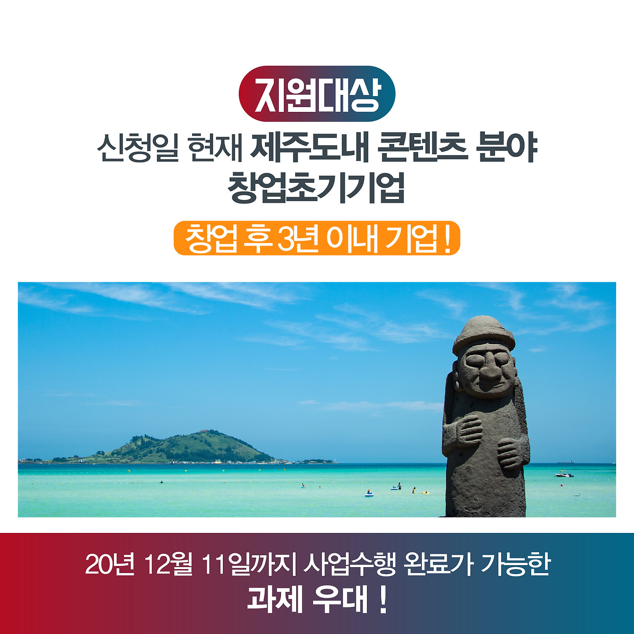 지원 대상은 제주도 내 콘텐츠 분야 창업 초기기업으로 창업 후 3년 이내 기업을 대상으로 지원이 이루어질 예정이랍니다. 2020년 12월 11일까지 사업 수행 완료 가능한 과제에 예산을 선정하는데요.