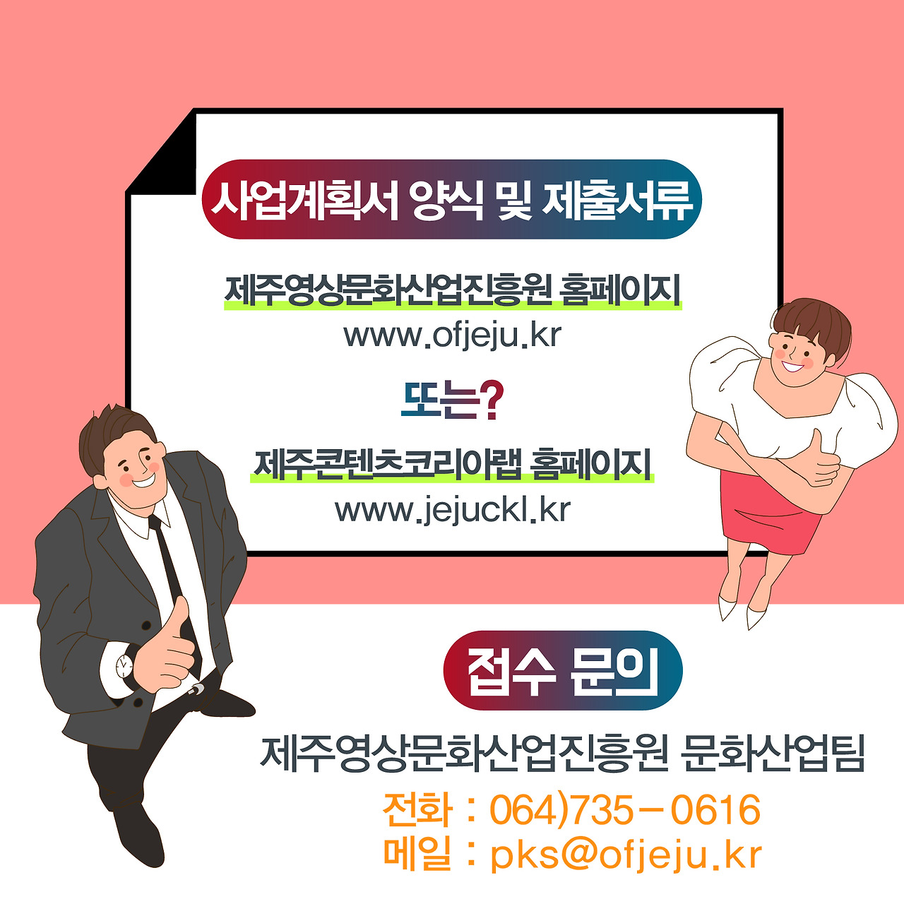 제주도 내의 기업들 중 이번 지원에 관련된 분야라면 참여 하여 많은 혜택을 받아보시기 바랍니다. 정확한 내용은 제주영상문화산업진흥원 홈페이지 또는 제주콘텐츠코리아랩 홈페이지를 통해 확인 가능하며 하단 링크를 참고하시기 바랍니다.