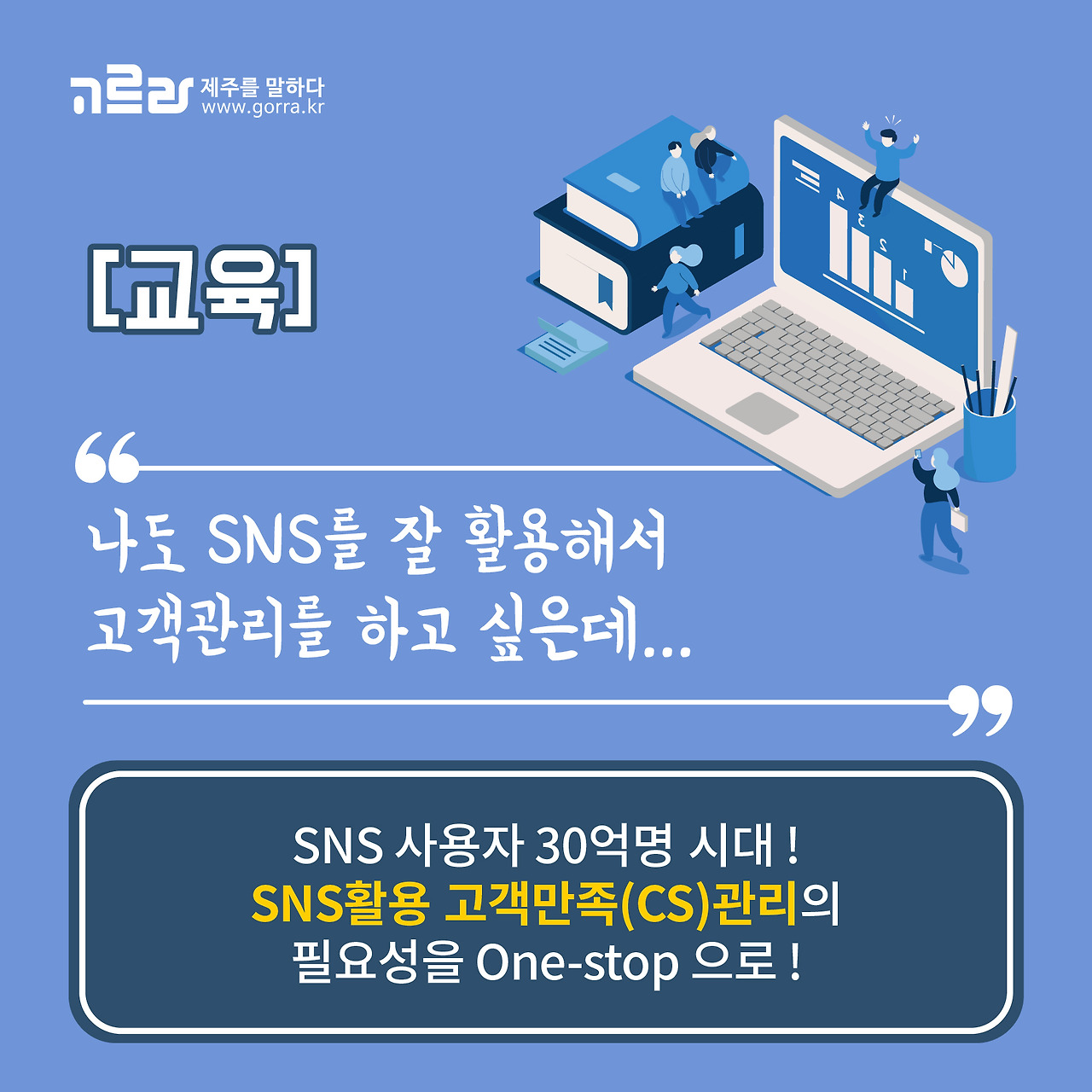SNS를 잘 활용해서 고객관리를 하고 싶은 사장님들을 위한 교육 솔루션! 블로그, SNS, SNS활용, 마케터 양성, 전문가 양성, 서비스 경영을 전문적으로 알려드립니다! SNS 사용자 30억 명 시대에 나도 빠질 수 없지! 든든한 두 명의 강사들과 함께하는 신나는 고르라의 교육에 함께해보세요~