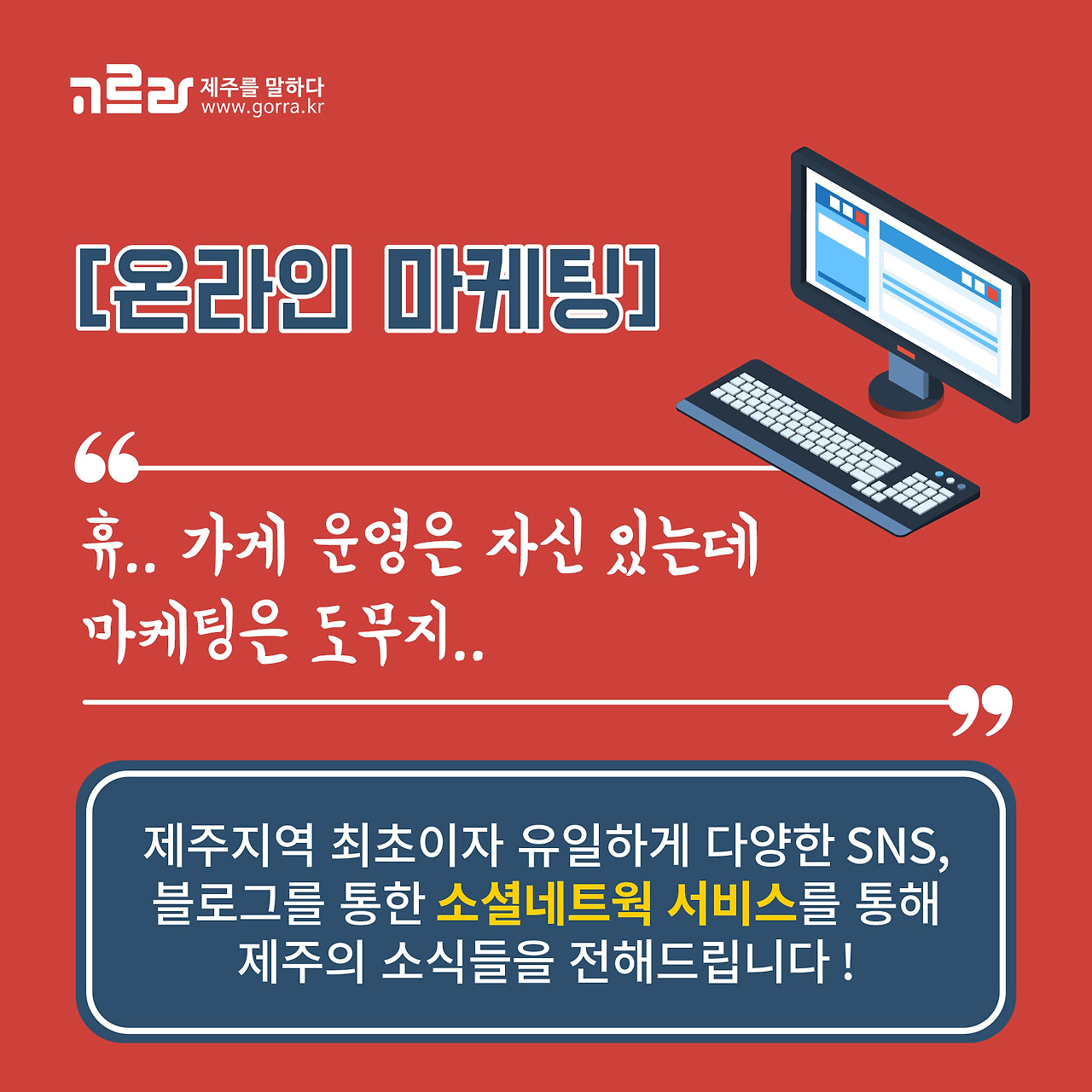 "가게 운영은 자신 있는데 마케팅은 도무지..." 마케팅의 벽에 어려움을 겪고 계신 분들을 위한 온라인 마케팅 사업부! 온라인 SNS/블로그 마케팅, SNS/블로그 운영대행, SNS/블로그 이벤트 운영대행을 맡고 있습니다. 제주지역에서 최초이자 유일하게 블로그를 비롯해 인스타그램, 페이스북, 카카오스토리, 포스트, 폴라, 브런치 등의 SNS를 운영하며 소통하고 있답니다^^