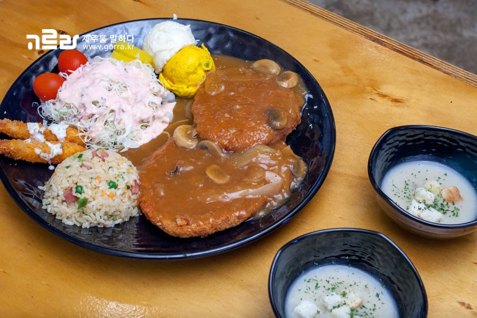 여기에 겨울맞이 신메뉴인 '돈가스'는 두툼한 돈가스에 진한 소스의 맛이 일품인 메뉴로 수프부터 시작해 돈가스, 돈가스 소스, 고구마 샐러드, 감자 샐러드, 야채샐러드 소스 등 하나하나 모두 사장님의 시크릿 비법이 들어간 레시피랍니다^^