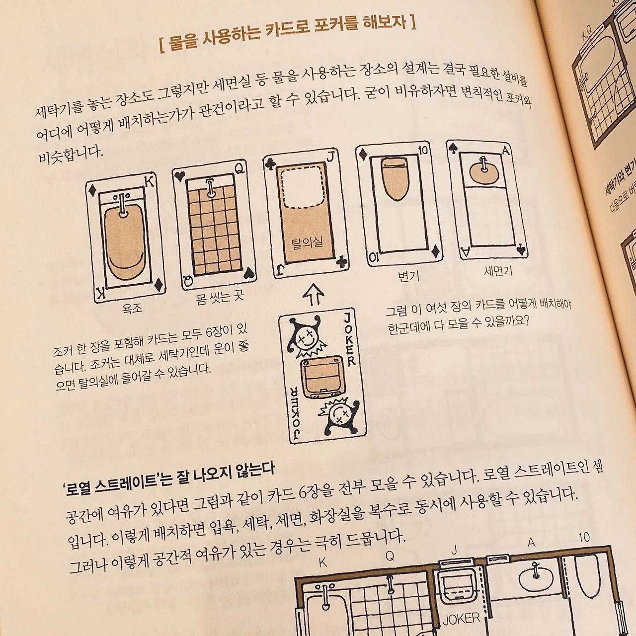 마스다 스스무의 주거 해부 도감에서는 방의 배치를 카드놀이에 빗대어 설명합니다. 책에서 말하는 것은 집짓기 수준 공간 배치를 말하는 것이지만, 인테리어 할 때 가구 배치에 활용할 수 있어 보입니다.