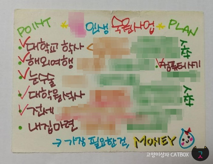 너무 힘들었던 어느 날. 집에 도착하자마자, ‘인생 계획 7가지’를 알록달록 써 내려갔었다. 30대 초반에 어느 정도 이뤘는지 봤더니 6가지를 이뤘더라. 그 안에 없었던 결혼. 그것을 하게 되었다.