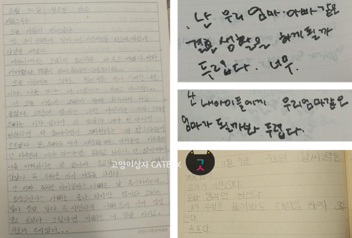 ▲ (좌)초등 고학년 때, (우상중)중학생 때, (우하)초등 저학년 때의 일기장 갈무리. 결혼생활은 생각보다 괜찮은 것 같고, 괜찮은 엄마만 되면 될텐데... ⓒ고상(고양이상자)