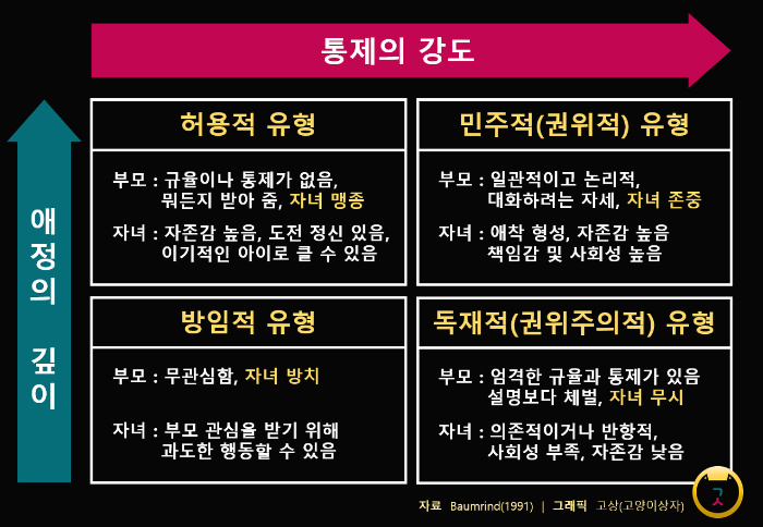 물론, 부모의 유형을 이 4가지로만 나눌 수 있는 것은 아니며, 부모 유형대로 자녀가 성장하는 것은 더더욱 아니다. 그렇게 자랄 가능성이 높다고 생각하면서 참고하면 된다. 자신의 부모가 민주적(권위적)이지 않다고 해서 꼭 자존감이 낮고 사회성이 부족한 사람으로 성장하는 것이 아니다. 가정환경이 이러니 어쩔 수 없다며 자포자기하지 말고, 자기 인생을 소중하게 생각하면서 자신만의 길을 찾길 바란다. 그리고 자신이 그런 부모가 되지 않도록 노력하면 좋겠다.