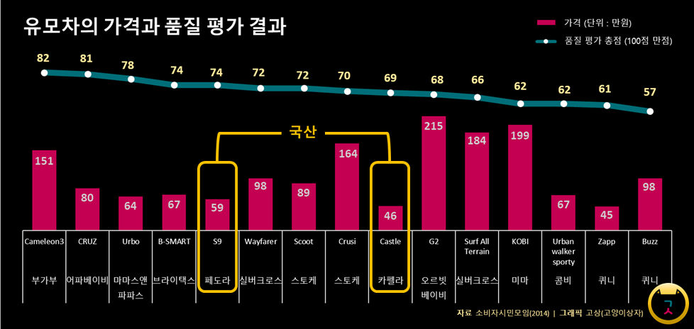 같은 단체에서 2014년에 유모차의 안전성, 내구성, 강도, 안정성에 대해 테스트한 결과, 조사 대상인 15개 제품 중, 13개의 제품이 영국 표준 및 유럽연합 안전 기준(BS EN 1888: 2012)을 모두 충족한 것으로 나타났다. 즉, 가격 차이는 크지만 품질 차이는 크지 않다는 것이다. 가격이 두 번째로 저렴한 국산 카펠라가, 그 보다 4배 이상 비싼 오르빗 베이비보다 품질 평가 점수가 더 높았으며, '구매할 가치 있음' 등급으로 평가받은 유모차 중에 가장 저렴한 유모차는 국산 페도라로 나타난 것이다.
