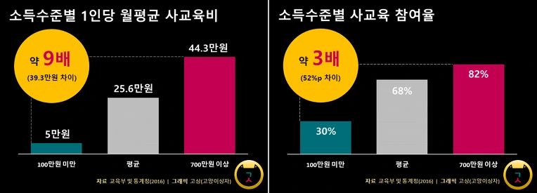 게다가 가계 소득 수준에 따라 지출되는 월평균 사교육비의 차이도 크다. 소득 100만원 미만인 가계는 1인당 월평균 사교육비로 5만원을 지출하지만, 소득 700만원 이상인 가계는 44.3만원을 지출하는 것으로 나타났다. 두 가계의 사교육비 지출 차는 약 40만원(약 9배)이다. 그리고 소득 100만원 미만인 가계는 평균과도 약 20만원의 차이(약 5배)가 난다. 참고로 사교육 참여율은 소득 100만원 미만인 가계 30%, 소득 700만원 이상인 가계 82%로, 약 50%p 차이(약 3배)가 난다.
