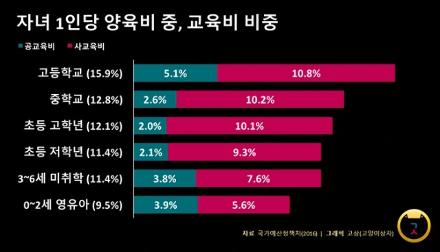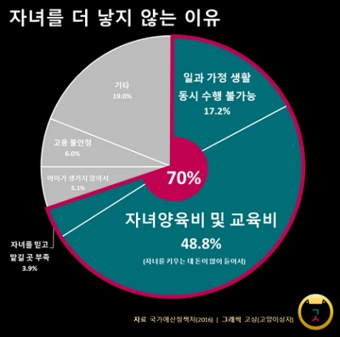 임신·출산·육아는 결국 돈이다. 정부는 임신과 출산 지원금인 바우처 50만원을 비롯해서, 출산축하금 및 양육수당 등(지역별로 다름)을 제공하지만, 일반 가계에서는 기본적인 양육비(식료품비, 의류비, 보건의료비 등) 뿐 아니라 교육비도 많이 들어가기 때문에 돈이 많이 필요하다. 게다가 교육비는 자녀의 학교급이 올라갈수록 비중이 커지기 때문에, 공교육비뿐 아니라 사교육비도 생각해야 하는 부모의 경제적 부담은 점차 증가한다. 우리나라의 사교육은 공교육을 보완하는 수준을 넘어, 필수로 인식되고 있으니까.
