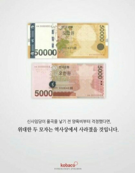 정말 황당했던 '공익' 광고가 있었다. 2012년 대한민국 공익광고 공모전 학생부 당선작. 이 광고에서는 신사임당이 양육비 걱정 따위 하지 않고 출산을 해서 위대한 두 모자가 되었다는 이야기를 하고 있다. 양육비 때문에 출산을 하지 못하겠다는 세대를 비판하고 싶었는지(임신·출산·육아는, 결국 돈돈돈), 저출산 문제를 개인의 문제로 축소하고 있다. 신사임당은 유복한 명문가의 딸이었다. 남편 집보다 더 잘 살았던 집안이다. 그런 그녀가 웬 양육비 걱정? 게다가 이 광고는 신사임당에 대한 이해뿐 아니라, 시대에 대한 이해도 부족한 광고다. 그 시대의 자녀 출산은 선택의 대상이 아니라, 당연히 하는 일이었는데 말이다. 이래저래 고통받는 것은 신사임당이다.