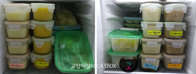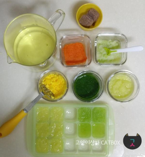 ▲ 좌)중기 이유식 초반 3~4개씩 만들 때, 우)중기 이유식 중반 기본죽을 끓인 후 다양한 큐브를 넣을 때. ⓒ고상(고양이상자)