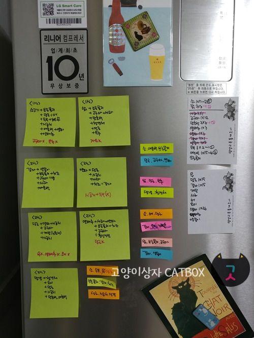 냉장고 외벽에 식재료 궁합을 고려한 기본적인 식단과 큐브 재고 현황을 큰 포스트잇으로 붙여 놓고, 그 두 가지를 살펴보면서 작은 포스트잇에 식재료 조합을 적어 붙였다. 이렇게 계획하면 중복되지 않는 다양한 이유식을 만들 수 있으며, 만들 이유식의 순서도 변경하기 용이하다.