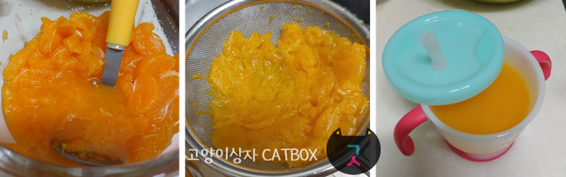 ▲ 귤 껍질을 깐 후 통에 담아 귤을 눌러 즙을 낸다. 그 후에 체에 걸려서 과즙만 먹인다. ⓒ고상(고양이상자)