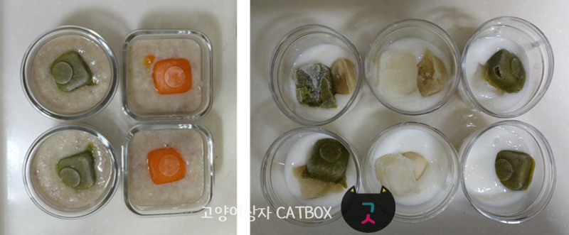 ▲ 좌)소고기죽을 끓여 4개로 소분한 뒤, 반은 브로콜리 큐브를, 반은 당근 큐브를 넣었다. 우)쌀죽을 끓여, 채소 큐브를 두가지씩 넣었다. ⓒ고상(고양이상자)