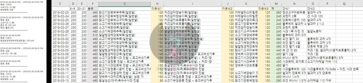 먼저, 앱에서 데이터를 받았다. 텍스트 파일로 다운로드되기 때문에 엑셀로 변환하여 기초 자료 정리 작업을 시작했다. 이번 분석에서는 수유와 이유식 데이터만 필요하기 때문에 나머지 데이터는 삭제하고, 일정 패턴이 잡힌 후에 누락된 데이터가 발견되었을 때에는 다른 기록도 찾아보면서 보완했다. 데이터 분석을 할 때면 항상 느끼지만, 이런 기초 반복 작업은 시간이 오래 걸려서 중간중간 포기하고 싶은 순간이 온다. 그 순간을 이겨내면 느낄 수 있는 뿌듯함 때문에 이 작업을 좋아(하려고 노력한다)한다.