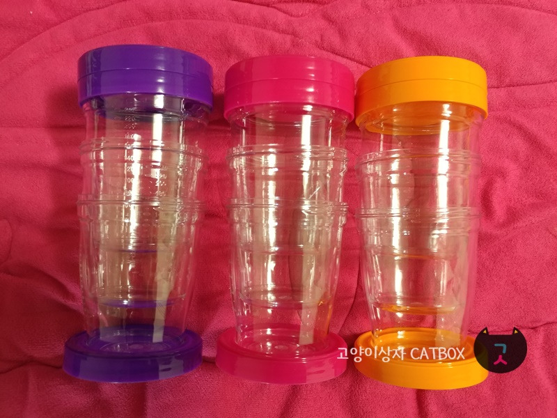 이유식량이 늘어나면서, 후기와 완료기에 사용할 이유식 용기를 추가로 구입했다. 더 큰 용량의 유리 용기는 너무 무거울 것 같아서(손목 힘이 풀려서 종종 그릇을 놓쳤다) 플라스틱의 장점과 유리의 장점을 가지고 있는 트라이탄 소재 용기를 샀다. 이 용기는 눈금이 표시되어 있어서 이유식량을 재기 편리할 것이라 생각했지만, 이유식을 만들어 담을 때 의외로 눈금이 잘 보이지 않아 불편했다. 그래서 용기의 150mL 부분에 아가의 방수 이름 스티커를 붙여 사용했다.