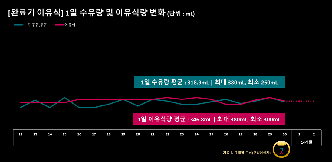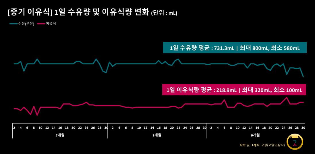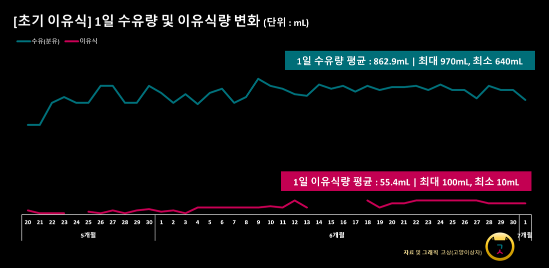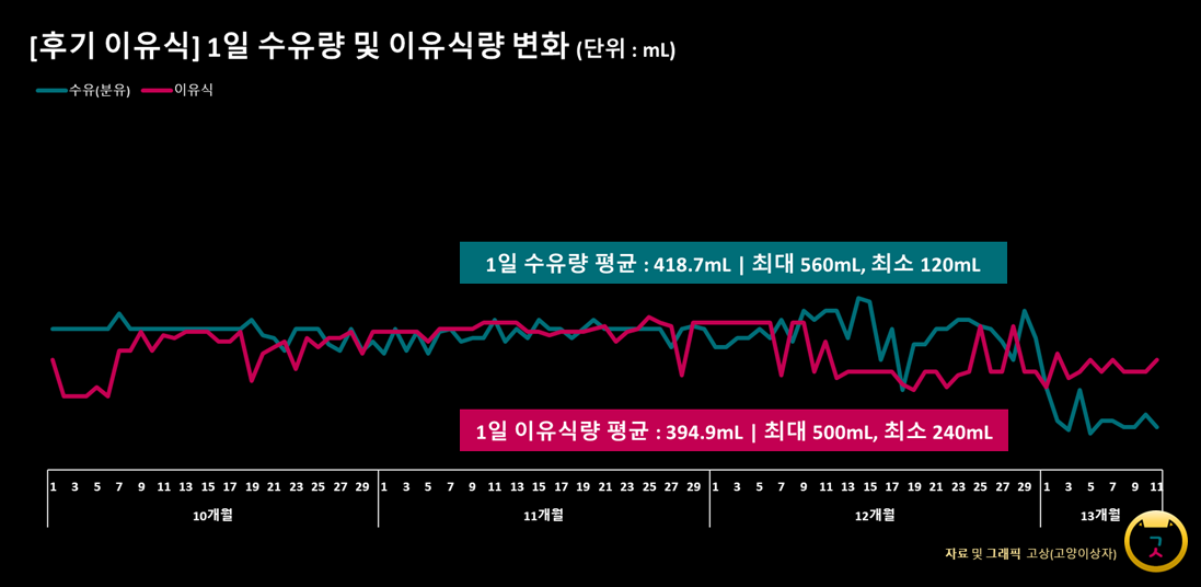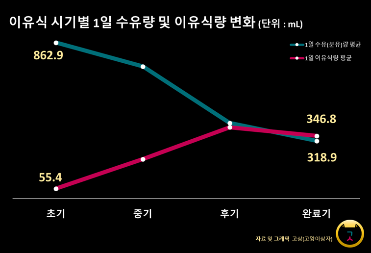 정리한 기초 자료를 토대로 전반적인 분석을 해봤다. 이유식 시기별로 1일 수유량 및 이유식량 변화를 살펴본 결과, 초기에는 주식인 수유량이 압도적으로 많은 것에 반해, 후기에는 수유량과 이유식량이 비슷해지다가, 점차 이유식량이 더 많아졌다.