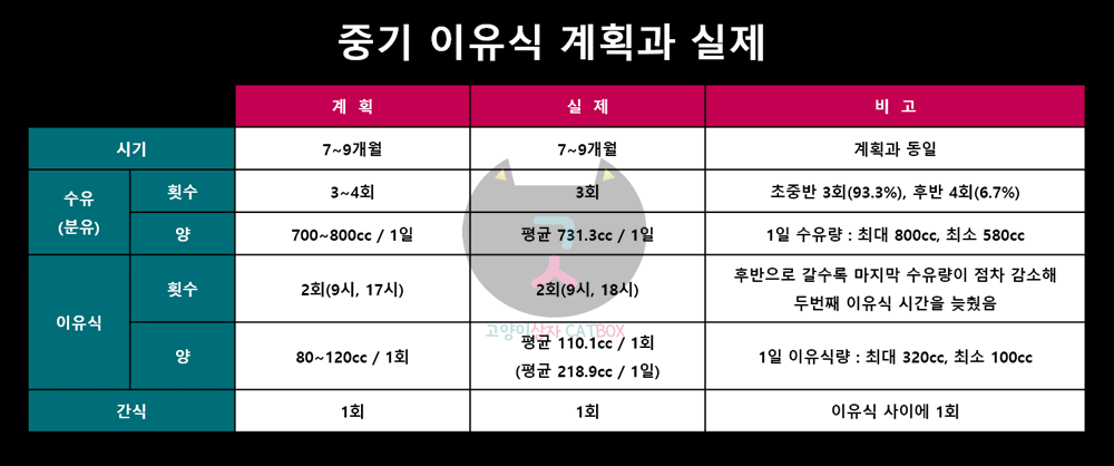 1일 수유 계획은 3~4회로 세웠으나 대부분 3회(93.3%) 수유했다. 초기와 마찬가지로 1일 수유량은 계획한 양과 실제 먹인 양이 비슷한 것으로 나타났다. 또한 이유식을 진행할수록 아가가 잠들기 전에 먹는 마지막 수유량이 감소했는데, 아가 스스로 수유량을 조절하는 것으로 보여서 무척 신기했다.