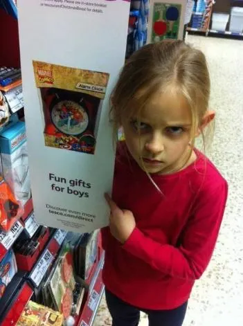 ▲ 7살 영국 소녀가 장난감 매장에서 "for boys"라고 쓰인 것을 들고 항의하는 모습.이후 해당 매장에서 공식 사과를 했다고 한다.