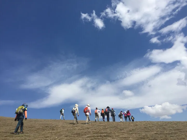 복드항산 코스는 하늘 맛을 느낄 수 있는 길이다. 하늘과 나 사이에 아무것도 없다는 느낌을 경험할 수 있다. 제주에서 오름을 올라본 사람들은 비슷한 느낌을 받을 것이다. 제주의 오름에서 포토샵으로 나무를 지우고 푸른색을 황갈색으로 바꾸면 바로 복드항산 코스가 된다. 초반부에 제주의 오름과 같은 언덕 4개를 연속해서 오르는데 다양한 각도에서 땅과 하늘이 맞닿은 모습을 볼 수 있다. 자갈과 짧은 풀밖에 없어 황량해 보였는데 걸어보니 메뚜기 천지였다. 발을 디딜 때마다 수십 마리가 팔짝 뛰었다.