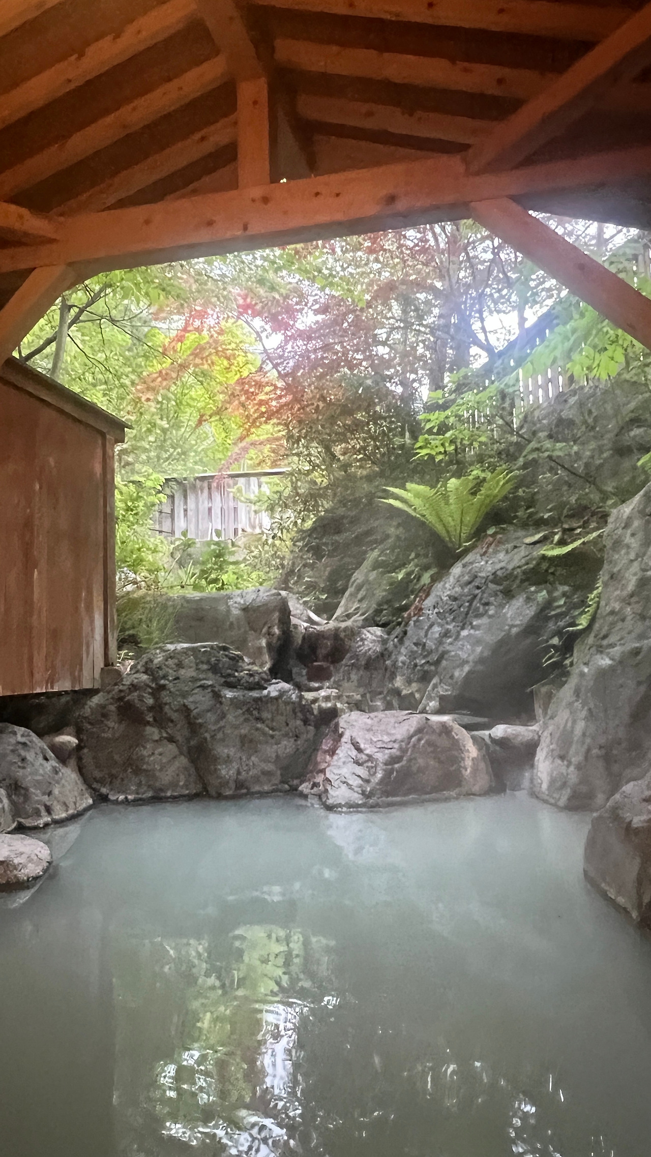 마을 전체로 온천수 인심이 좋다. 족탕도 이곳저곳 있지만 가장 큰 매력은 노천탕이다. 누구나 잠시 담그고 갈 수 있는 노천탕이 있다. 내가 묵는 료칸에도 외부에 공개된 노천탕이 있다. 들어가 사용하고 푯말만 ‘입욕중’으로 바꿔 걸면 된다.
