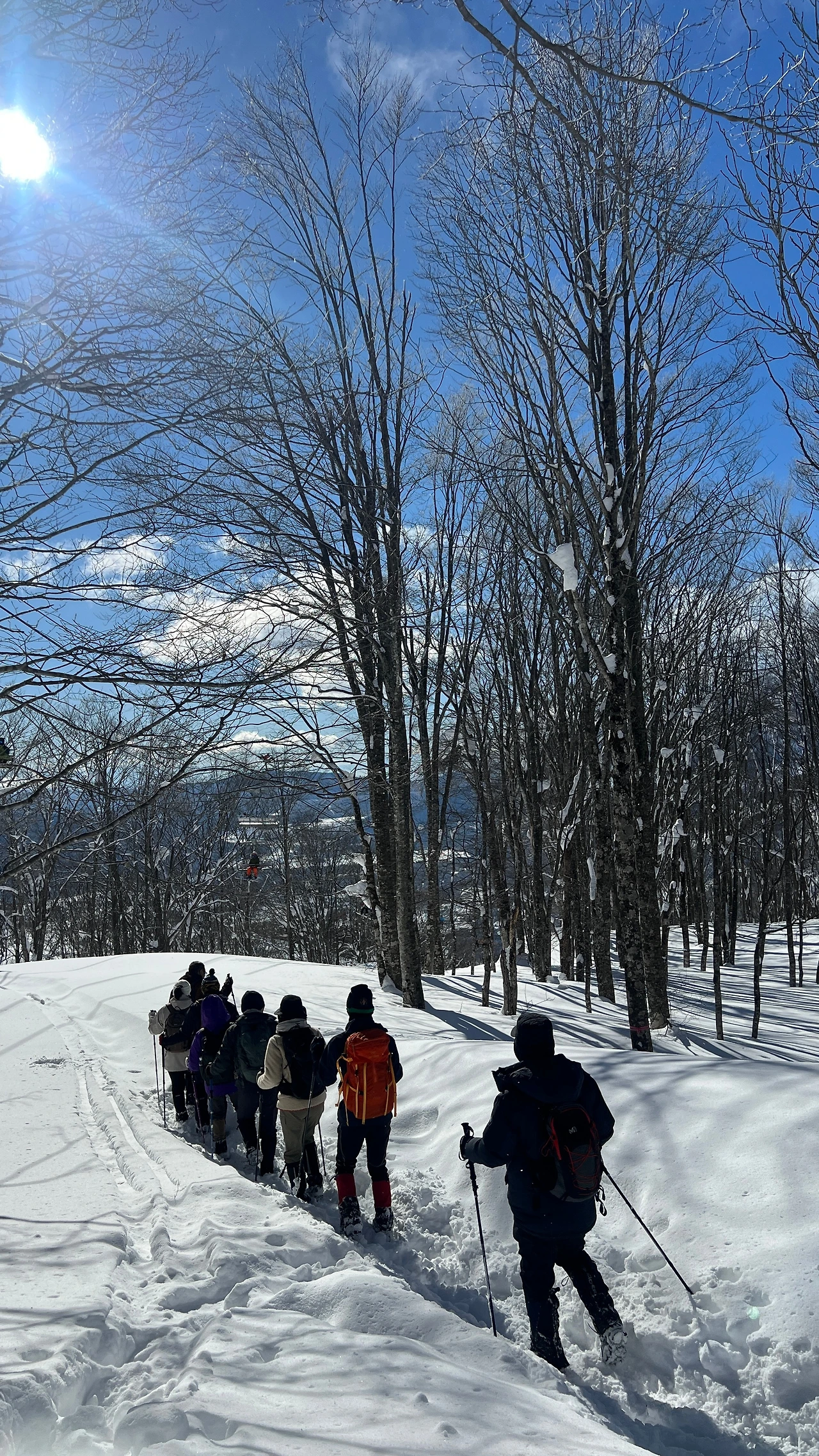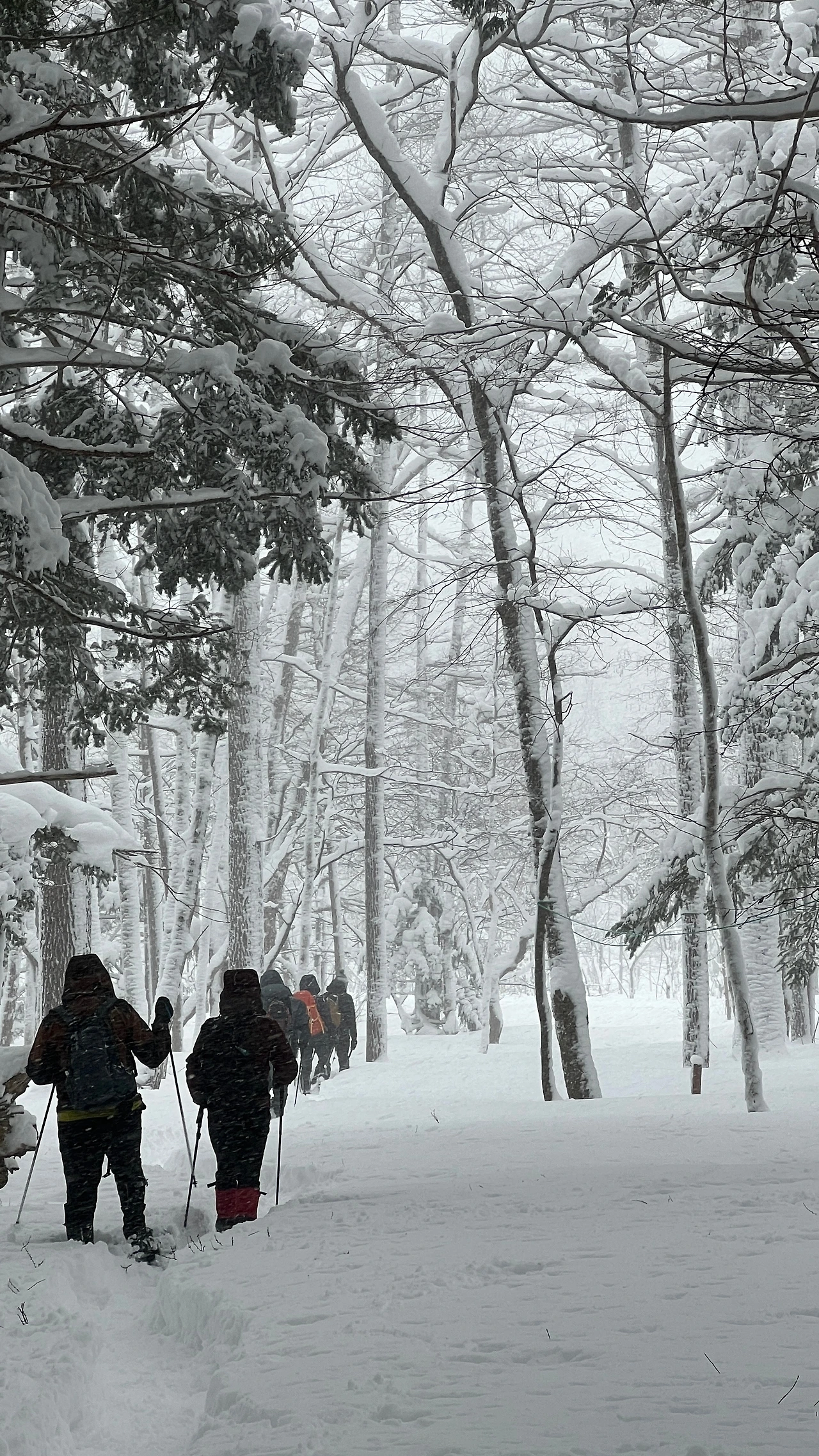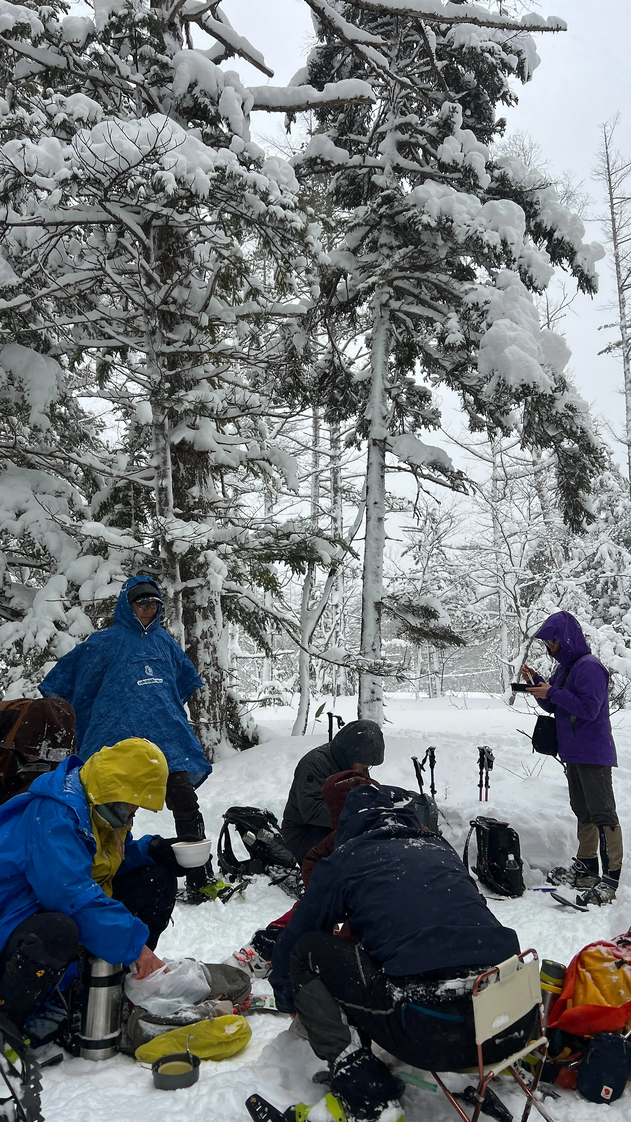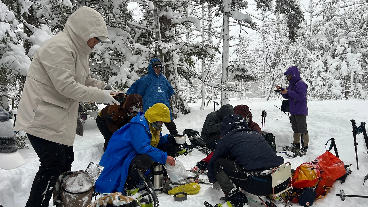 밤새 눈이 1m가 왔다. 마냥 좋아할 일이 아니었다. 러쎌 산행을 해야 했다. 눈을 밟아 다지면서 전진해야 했는데, 힘에 겨웠다. 목표 지점에 한참 못 미치는 곳에서 벤또를 먹기로 했다. 이렇게 눈밭에서 먹는 것도 별미라고 맛있게 먹고 있는데 돌풍이 불어 나무에 쌓인 눈이 폭포처럼 쏟아부었다. 눈물 아니라 눈에 젖은 도시락을 먹으며 새해를 시작.