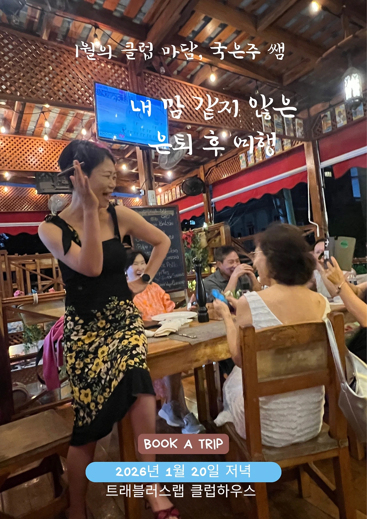 체력이 안 좋은 스타일로 전혀 보이지 않는데 본인은 저질 체력이라고 우기십니다(실제 여행을 해보면 그런 것도 같고). 암튼 여행체력이 안 좋은 분이 마음이 앞선 여행계획을 세웠다가 현장에서 들었던 생각을 잘 정리해 주셨습니다. 누구나 공감할 수 있는 내용일 겁니다. 1/20 국은주 쌤을 모시고 2026년 첫 번째 여행토크를 해보려고 합니다.