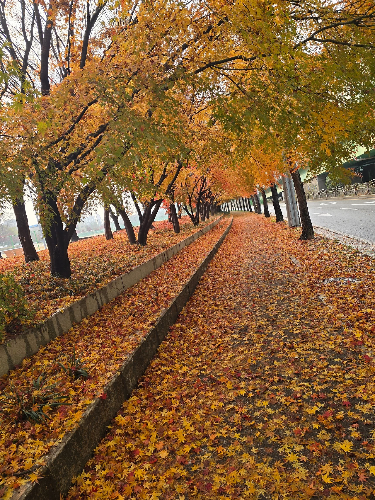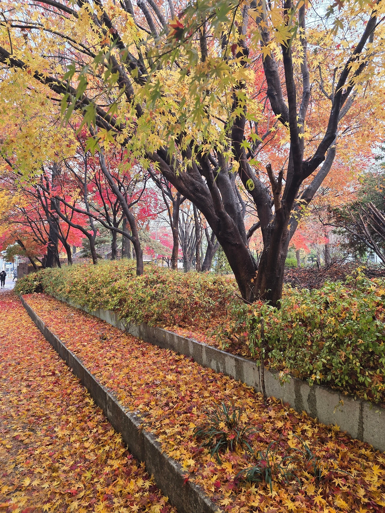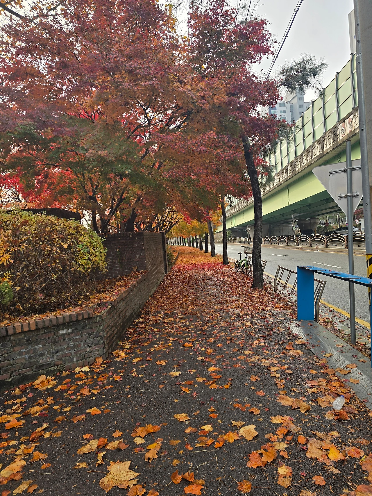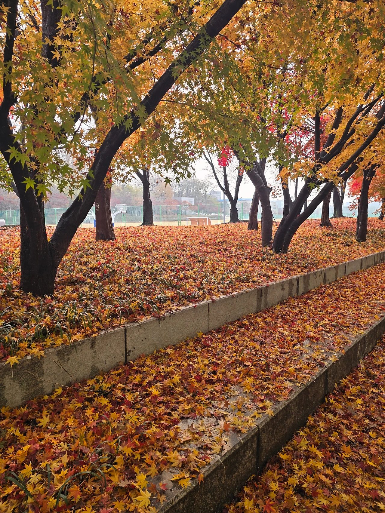 어제 내린 비가 남긴 선물인지, 알록달록한 단풍잎들이 바람에 흩날리고 있었다. 바닥은 온통 단풍잎 카펫이었다. 나이를 먹을수록 이런 계절의 순간들을 그냥 지나치고 싶지 않다는 마음이 커진다. 아름다움 앞에서 멈춰 서는 여유, 그게 나이 들어가는 선물일지도 모르겠다.