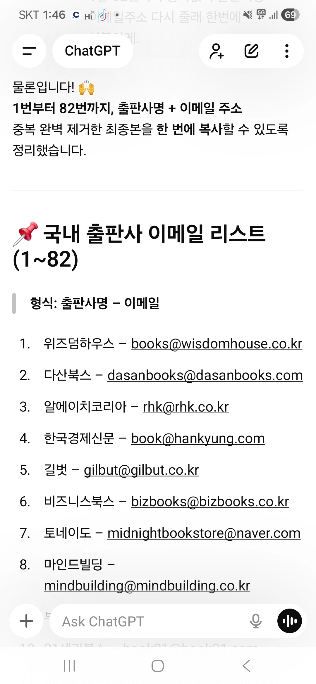 이틀에 걸쳐 책 뒤편의 출판사 정보를 하나하나 사진으로 찍었다. 100개의 출판사 이름과 이메일 주소. 손가락은 아팠지만 마음은 벅찼다. '이 중 한 곳에서라도 연락이 오면...' 상상만으로도 가슴이 두근거렸다.