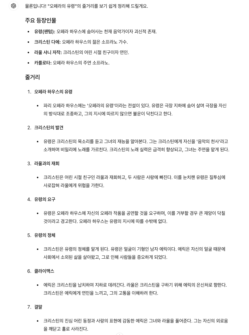 언뜻 생각난 게 크리스틴에게 노래 실력을 실어주는 팬텀이 나오는 "오페라의 유령"
