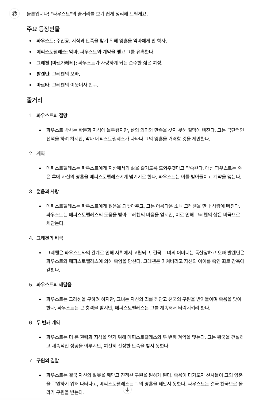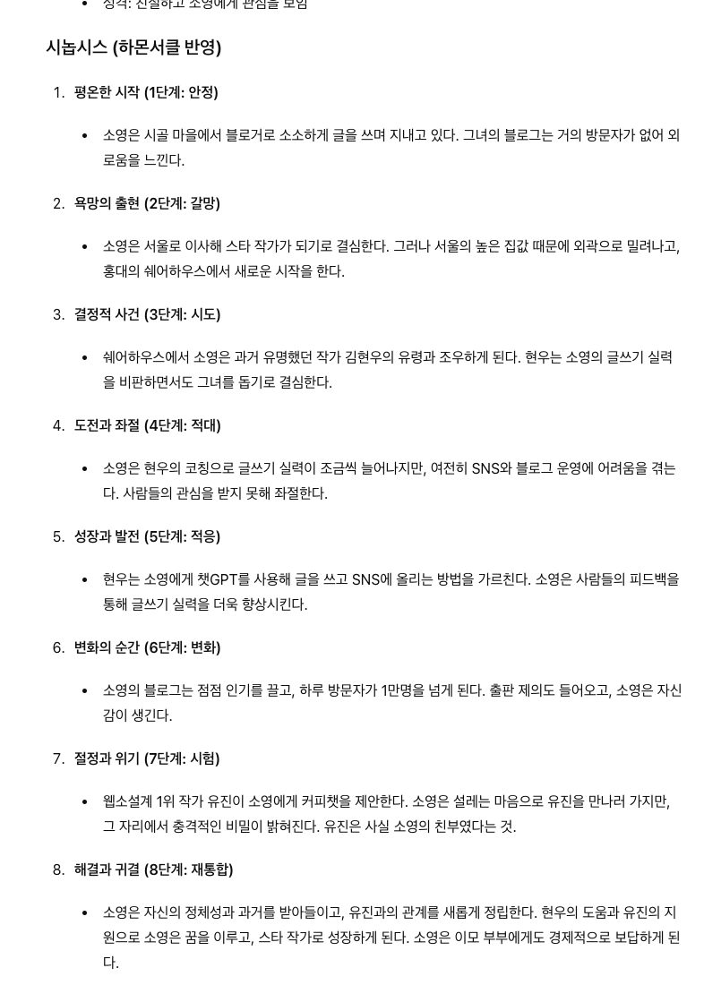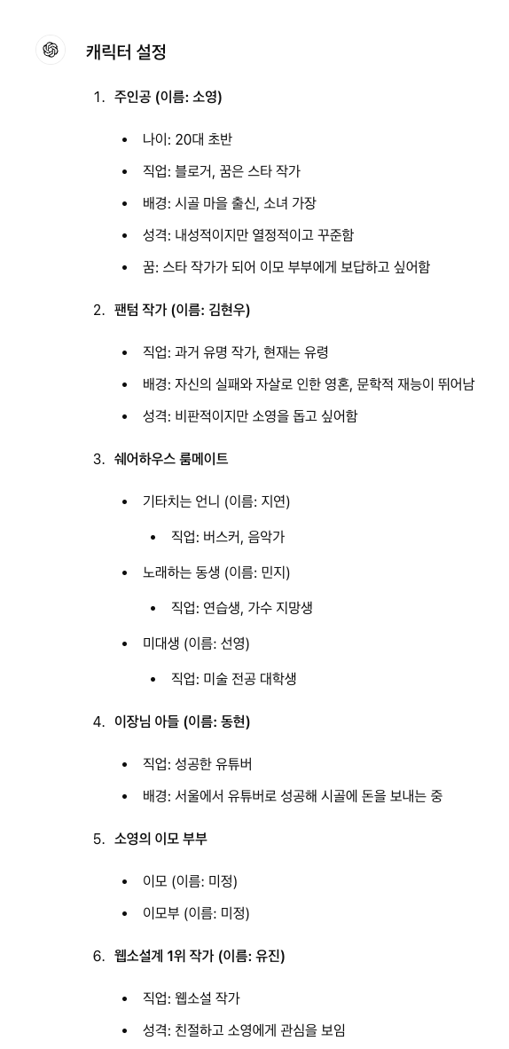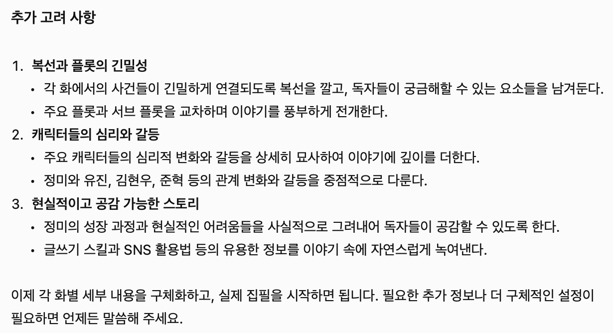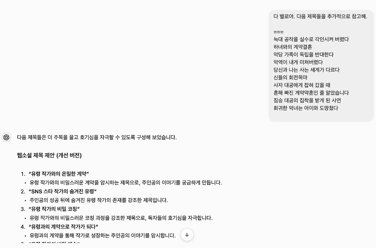 웹소설은 100회 이상은 넘어가는 경우가 많으니까 메인 플롯과 서브 플롯을 탄탄하게 잡아야 되서 몇 번에 거쳐서 계속 물어봤어요. 마음에 드는 게 나올 때까지 수정하고... 마지막엔 넘나 진부하고, 재미없어 보여서... 도저히 도저히 안 되겠어서 제가 플롯을 제안했습니다.