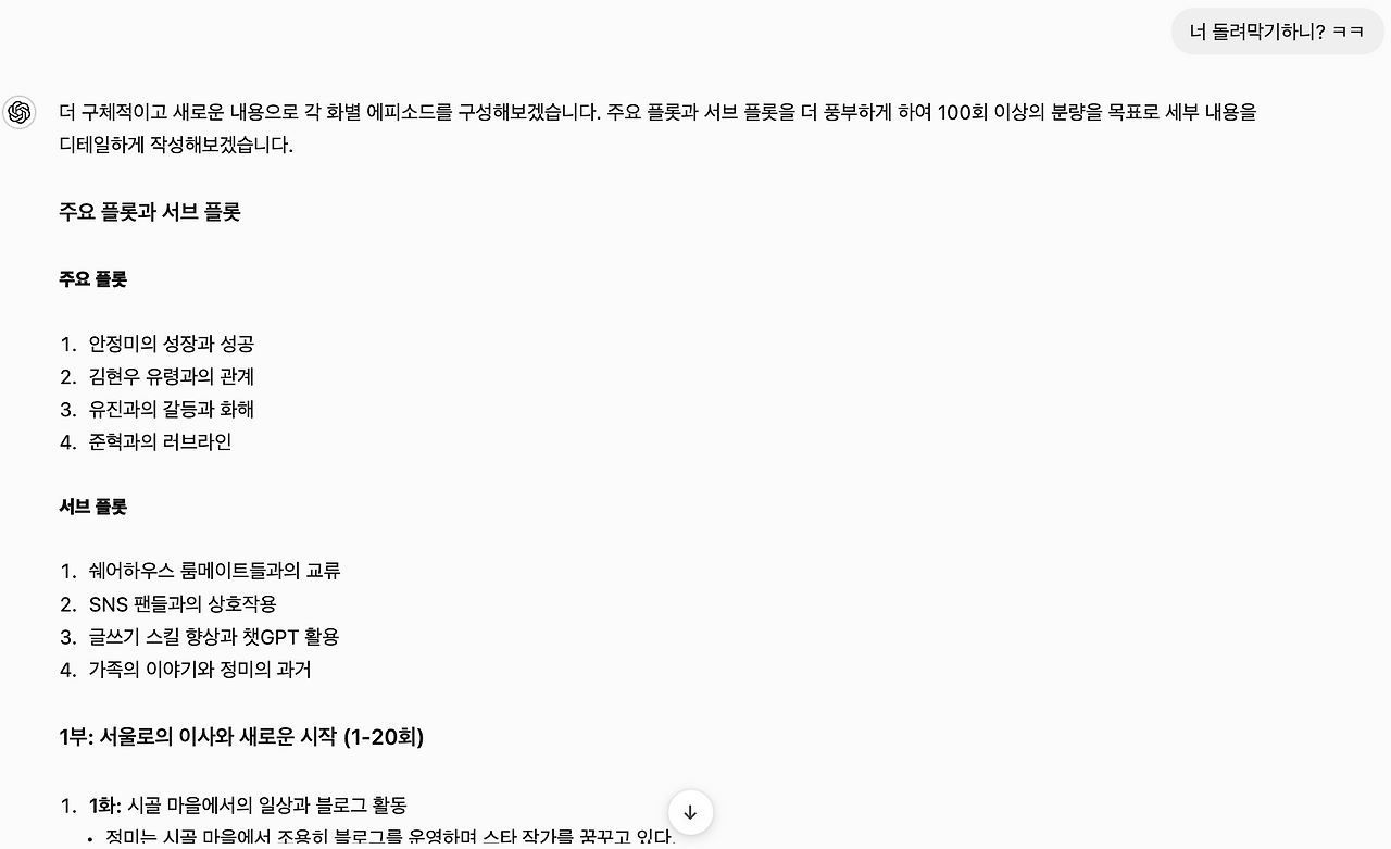나만 보기로 해서 제 캐릭터 구성, 메인 플롯, 서브 플롯, 진행되는 회차까지 knowledge파일로 넣어두면 그에 기반해서 움직입니다. 하지만 느낀 건 회차 진행이 될수록 이야기가 복잡해질수록 메인 작가인 저, 사람이 컨트롤 해야 할 게 많아지겠더라구요. 이 녀석이 놓치기도 하고, 잘못된 정보를 주기도 하니까 독자님들의 흐름이 깨지지 않게 메인 작가가 정신을 아주 그냥 바짝 차려야 합니다.