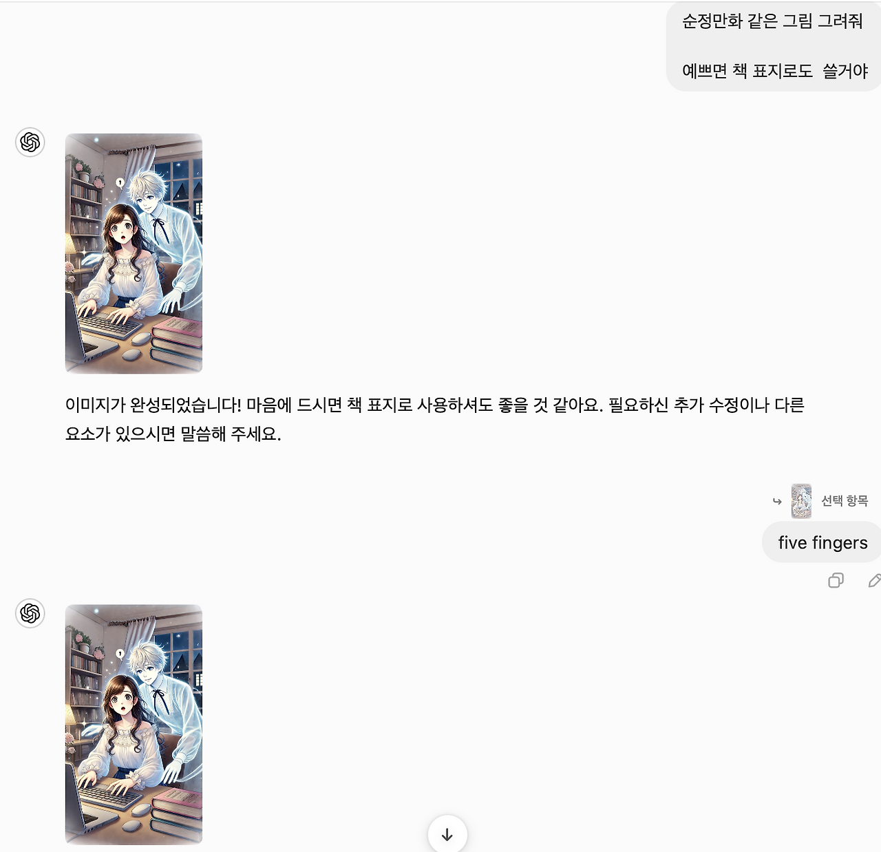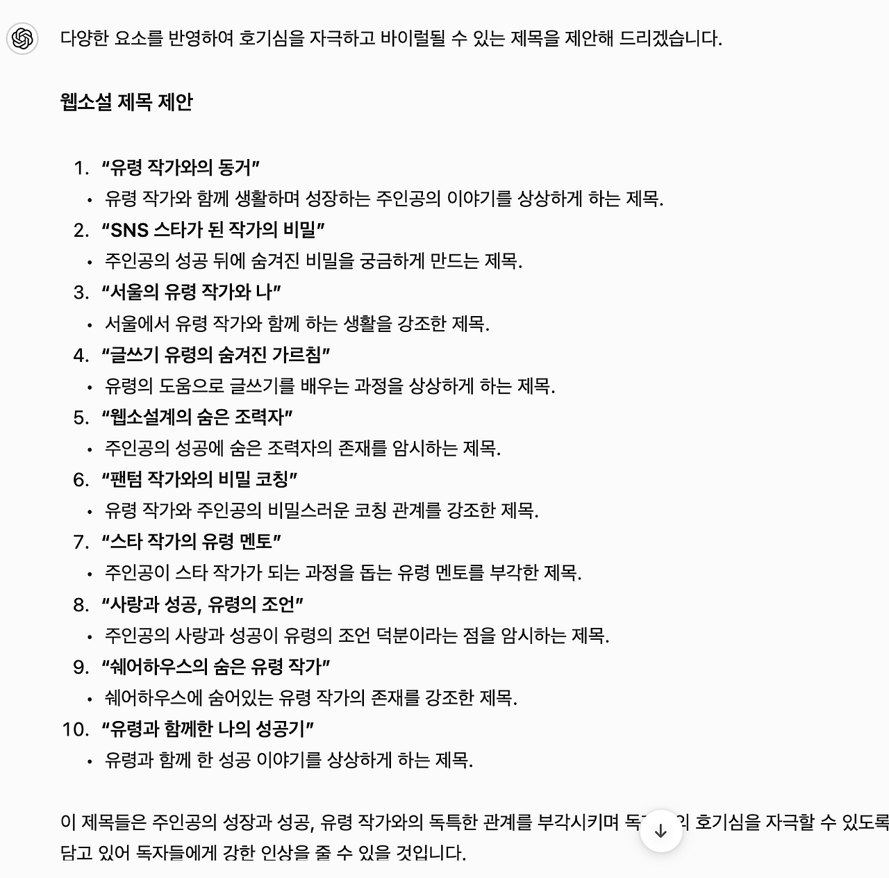 사실 늘 쓰고 싶다고 생각은 하고 있었기에 쓰고 싶었던 이야기들은 많았어요. 깨작거리고 세상에 내보내지 못한 습작들도 많아 늘 머릿속엔 아이디어만 둥둥 떠다니니... 뭐라도 하나 뜰채로 건져 올리면 무슨 이야기든 할 수 있다는 근자감으로 시작했다고 할 수 있습니다. AI강사로 활동하고 있는만큼 챗GPT의 도움을 받아보기로 했구요.