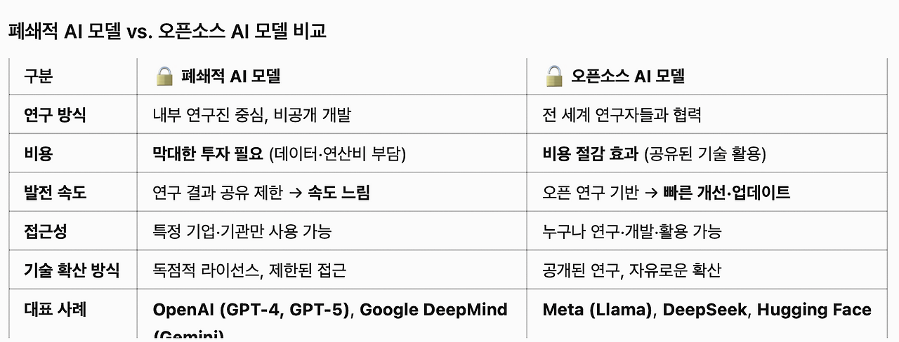 비밀로 지키면 기술이 유지되고 독점하여 발전시킬 수 있을 것 같잖아요? 하지만 아이러니하게도 ‘폐쇄적 AI’가 아니라 ‘개방형 AI’가 더 빠르게 진화하고 있습니다. DeepSeek가 단기간에 GPT-4급 모델을 만들어낼 수 있었던 이유도 바로 이 오픈소스 덕이죠.