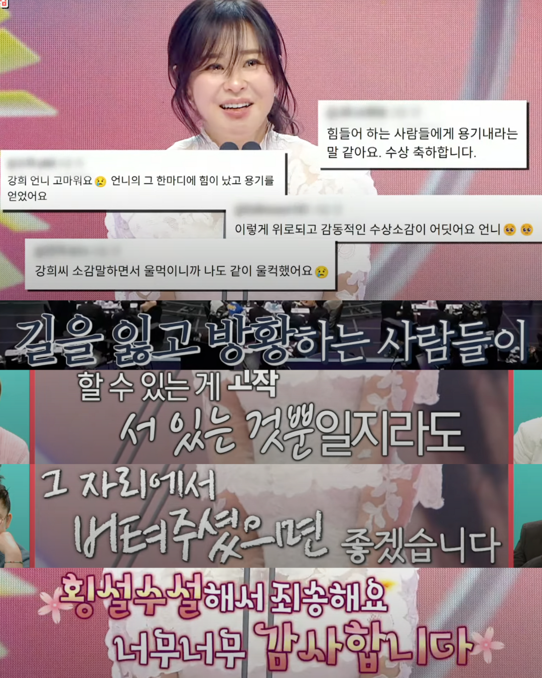 무대 위에서 그녀는 잠시 말을 잇지 못했다. 잠깐 동안의 오열 끝에 꽃다발을 든 손을 떨며 마이크를 잡았다.