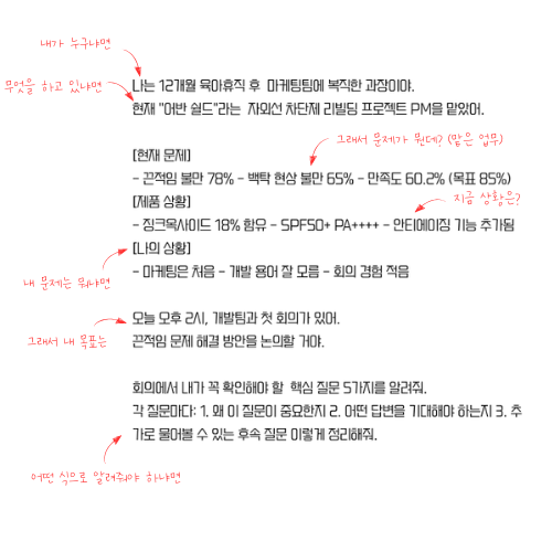 [나 + 프로젝트 + 문제 + 상황 + 목표 + 제약 + 요청 형식]