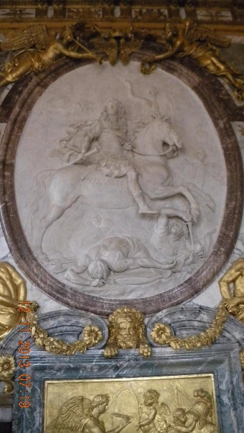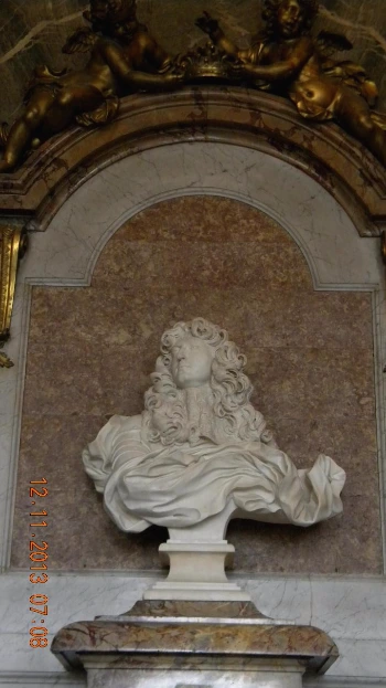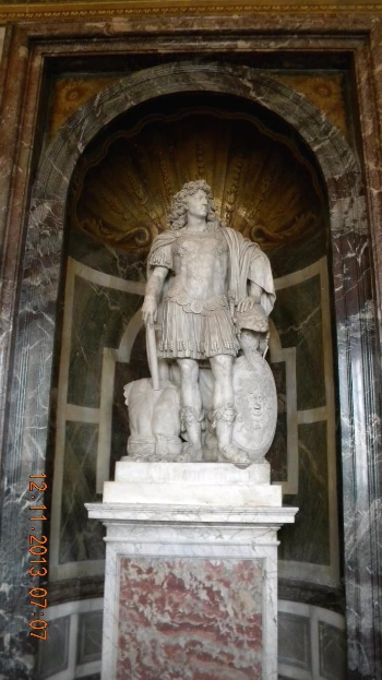 방의 정면에는 왕실 조각가 '장 바랭'이 조각한 고대 로마군 복장으로 무장한 '루이 14세'의 모습이 보인다.