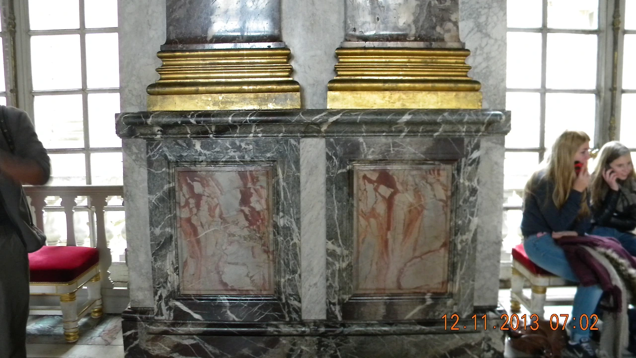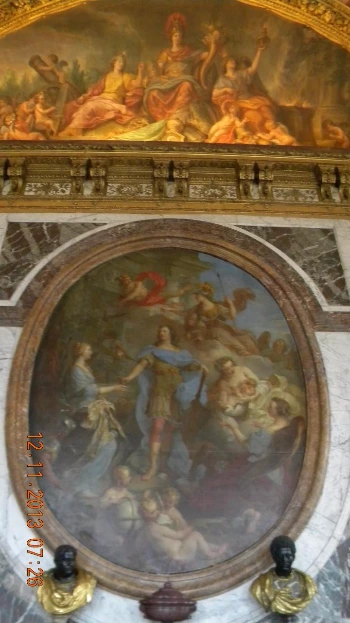 벽난로 위에 '유럽에 평화를 가져다 주는 루이 15세>라는 벽화는 유럽의 군주들이 버린 무기를 밟고 유런의 여신에게 평화를 상징하는 올리브 나무가지를 거만한 모습으로 건네주는 '루이 15세'를 묘사하고 있다.