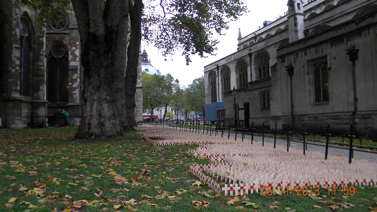 전쟁으로 죽은 이들을 애도하는 기간이어서 런던의 많은 사람들이 왼쪽 가슴에 붉은 꽃모양 브로치를 달고 다녔다. 그 꽃이 사원의 십자가에도 달려 있고 버스 광고판에도 붙어 있었다.
