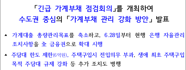 이번 발표는 '가계부채 관리 강화'라는 목표로 '대출' 규제를 통해 부동산으로 유입되는 유동성을 줄이겠다는 목적으로 보인다.