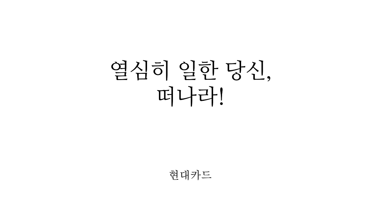 '저녁이 있는 삶'에서 10년정도 더 거슬러 올라가면 직장인들의 가슴을 뛰게 하던 이 카피가 있다. 2002년에 방영된 현대카드TV광고에는 30대의 미청년시절의 배우 정준호와 일찍 세상을 떠난 아름다운 배우 장진영이 등장한다. 힘든 업무를 지친 회사원들이 자신의 공간을 탈출해 어디론가 떠난다. 운전석의 유리창을 내리고 팔을 날개처럼 뻗어 운전하는 장면은 시청자들을 설레게 하기 충분했다. 해방감과 자유로움이 교차하는 두 사람의 모습 위에 얹어진 이 한 줄은 많은 이들의 마음을 흔들었다.