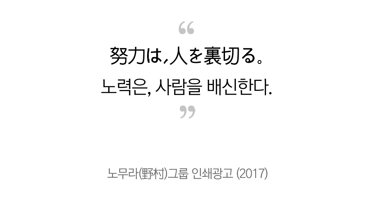 노무라그룹의 이 광고 카피는 영리한 전략으로 독자를 자신의 편으로 만든다. 당연한 명제 혹은 믿음을 정면으로 반박하는 헤드라인으로 먼저 눈길을 사로잡는다. 그리고는 후속 카피로 반전을 만들어 역설적인 주장에 힘을 보탠다. 헤드라인의 낚시질에 기분이 상하지 않는 것은 바디 카피의 메시지가 충분히 마음에 와닿기 때문이다. 뻔한 "천재의 노력 타령"에 그치지 않고, 공감할 만한 인생의 통찰을 던져주기 때문이다.