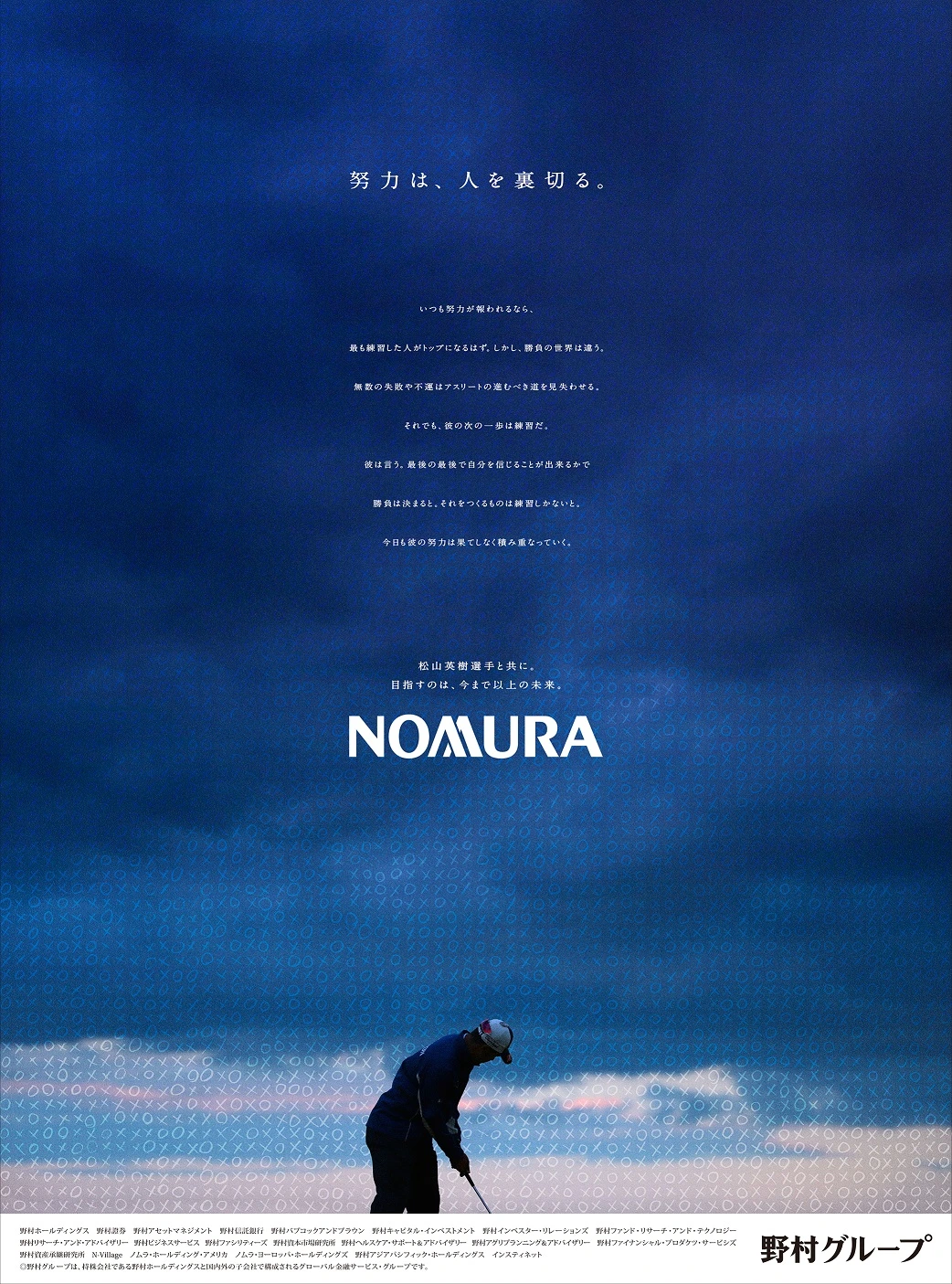 일본 최대의 증권회사인 노무라(野村)증권이 속해있는 노무라 그룹의 인쇄광고이다. 일본의 골프 천재 마쓰야마 히데키(松山英樹) 선수를 모델로 한 광고 시리즈 중 한편이다. 노무라증권은 마쓰야마 히데키 선수 공식 후원사 중 하나다. 그는 2021년 아시아인 최초로 PGA 마스터스에서 우승을 했고, 2022년에는 소니오픈에서 우승함으로써, 한국의 최경주가 가지고 있던 PGA 아시아인 최다 우승 기록을 깬 일본의 국민골퍼이다. 2022년 11월 현재 세계랭킹 19위에 올라있다.