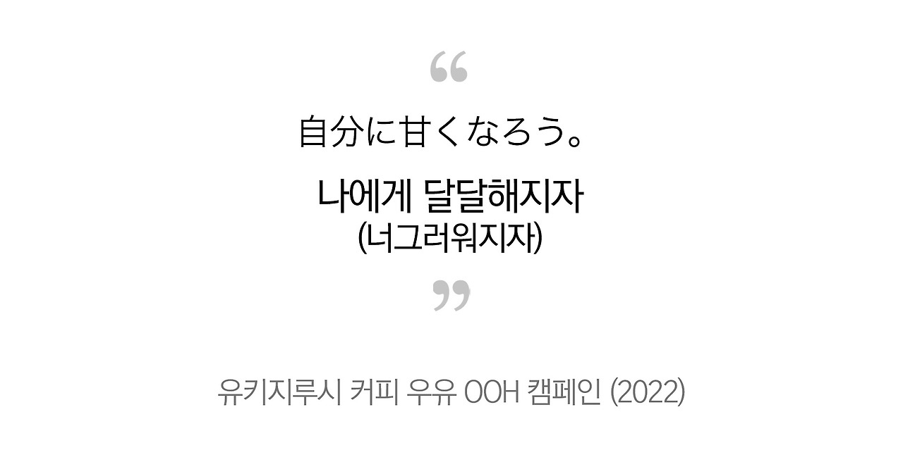 그런데 甘い 에는 너그럽다는 의미도 있다. 달콤한 커피우유는 근면과 열심을 강요받는 사람에게 자신을 너무 몰아붙이지 말라고 말을 건다. 스스로에 너그러워지라는 위로를 건넨다. 단어의 복합적인 뜻까지 연결시키고 나니, 중의적으로 의미가 착 붙는 완벽한 카피가 되었다. 달달한 커피를 마시자 → 나에게 달달해지자 →나에게 너그러워지자!