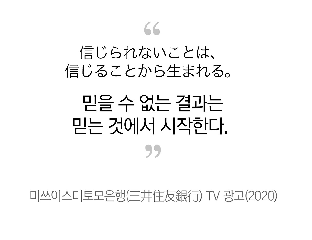 믿을 수 없는 결과를 우리는 가끔 '기적'이라고 부른다. 사전에 기적은 "상식적으로 생각할 수 없는 기이한 일"이라고 정의되어 있다. 상식적으로 생각할 수 없는 일이 지극히 상식적인 과정에서 만들어진다는 것, 이 광고가 다시 한번 일깨워줬다.
