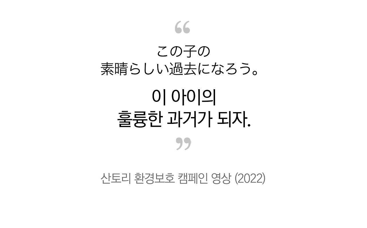 이 기억을 다시 꺼낸 것은 산토리의 환경 캠페인 광고 때문이다. 시리즈 광고 중 한 편인 이 영상에는 천진난만한 아이들의 모습이 시선을 사로잡는다. 이 귀여운 아이들을 위해 깨끗한 물을 미래에 전달해주자는 전형적인 공익 메시지가 전해진다.